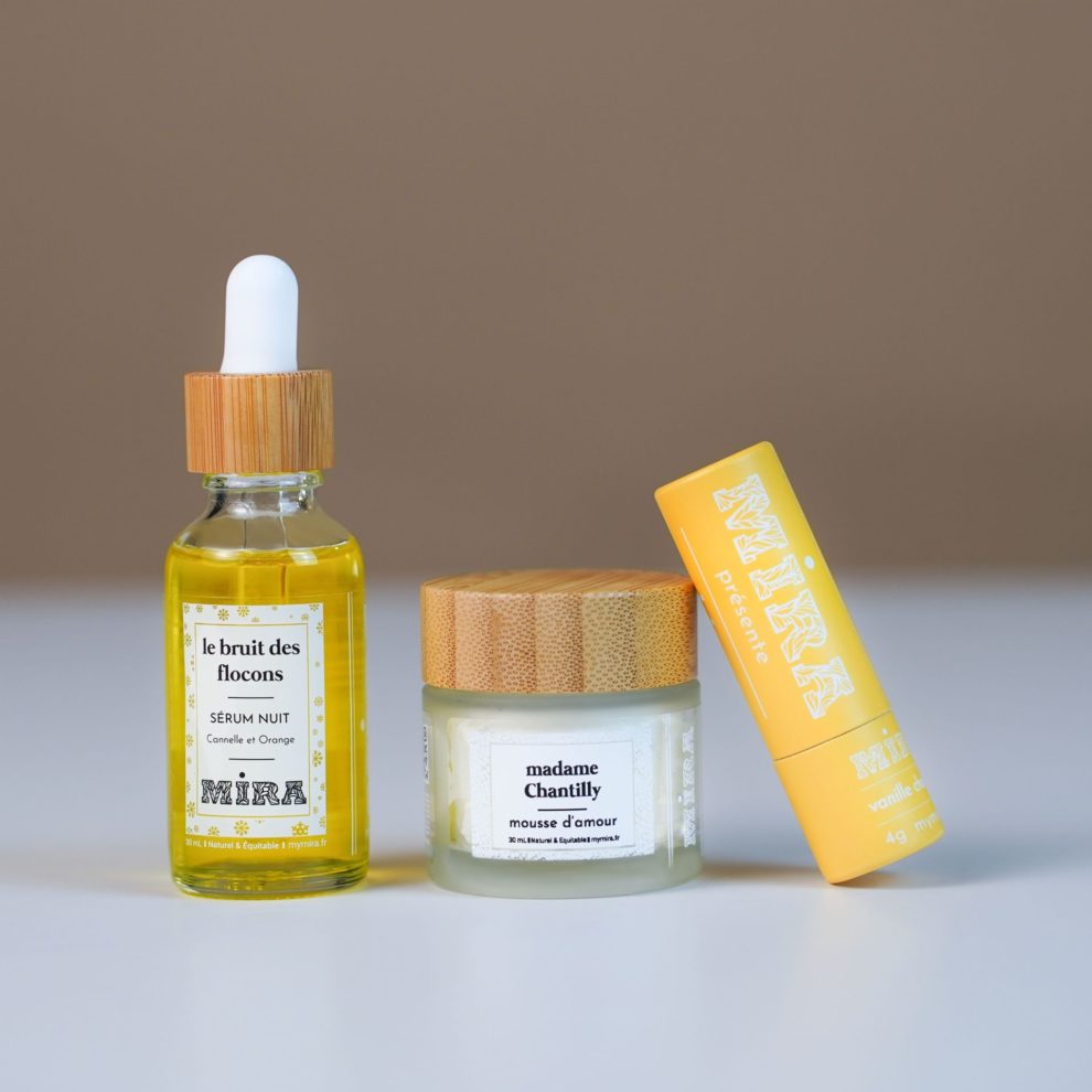 – Le Bruit des Flocons (30 ml) : notre sérum d’hiver par excellence. Trois huiles françaises (carthame, arnica, jojoba) et une odeur cannelle-orange qui rappelle les biscuits et les soirées au coin du feu. Apaisant, nourrissant, un petit trésor à glisser dans toutes les poches.