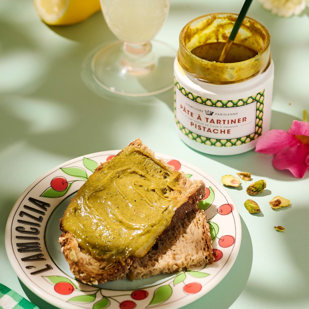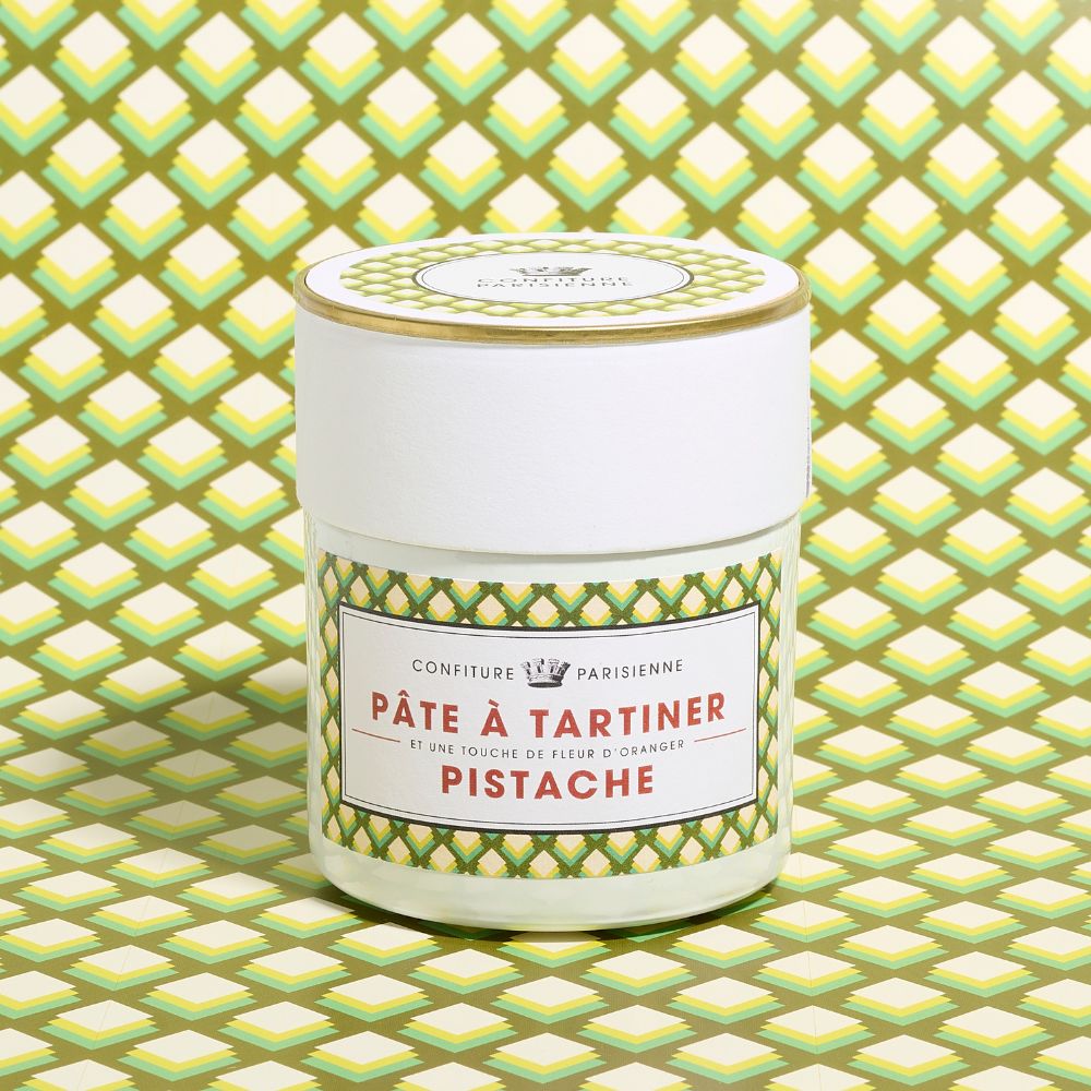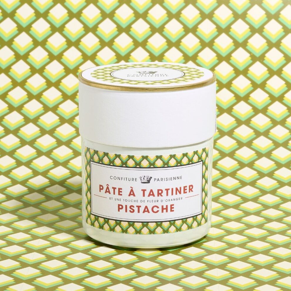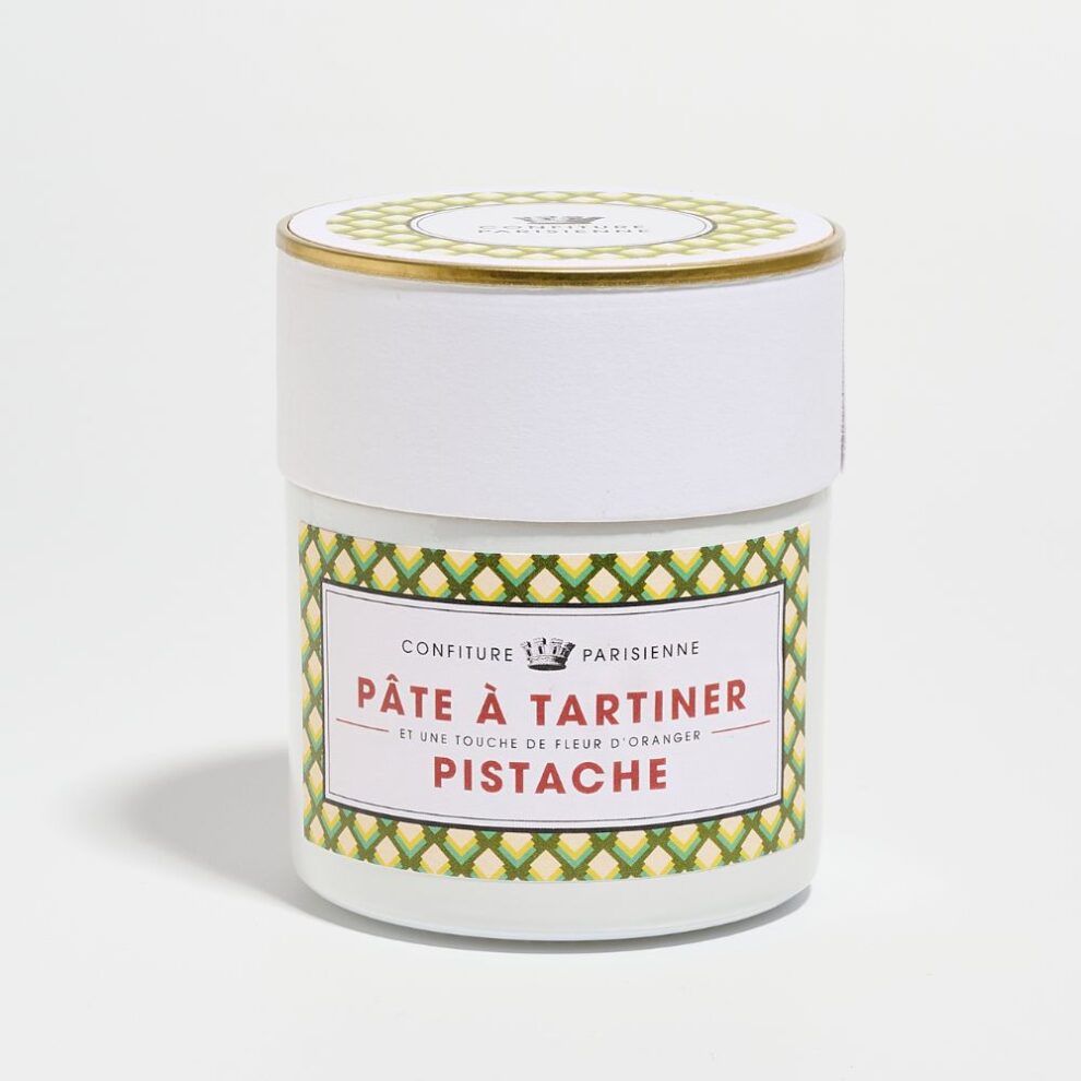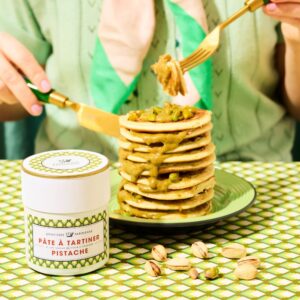 Crème onctueuse à base d’amandes et de pistaches d’Espagne, sucre glace, fleur d’oranger Maymana et pointe de fleur de sel. À déguster à la cuillère, sur une tartine ou dans un club sandwich au jambon truffé.